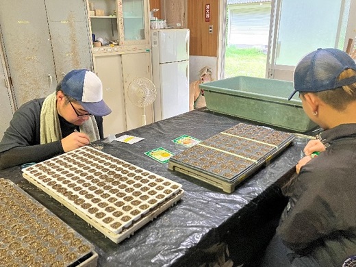 夏休みの当番実習の日に、9月に定植する野菜の播種作業に取り組んでいます。