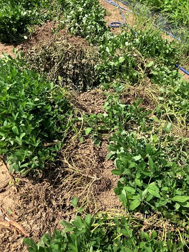 | 露地ほ場ですくすくと生育していた「らっかせい」が雑に掘りあげられていました。農大をえさ場にしているイノシシの仕業です。 見渡すとワイヤーメッシュに異常はなく、出入り口に小さなすき間があったので2重にして塞ぎました。