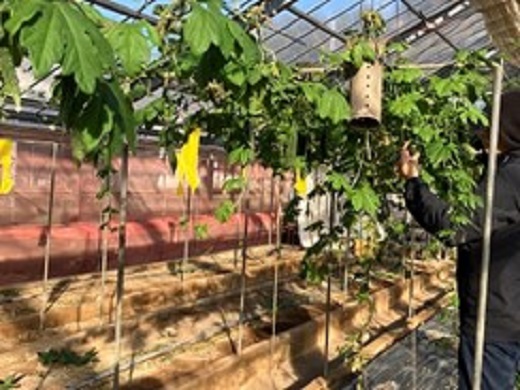 8月12日に播種、9月4日に定植した「にがうり」について、定植後1~2か月は生育や実付きが悪かったのですが、現在冬で、栽培適期の夏をとっくに過ぎていますが、温かいハウスの中で順調に実がなり続けており、季節外れの抑制にがうりの収穫・販売を継続しています。 これからさらに気温が低下しますが、しっかりと適正に管理し、穫れるところまで収穫したいと思います。 (園芸学科野菜コース学生)
