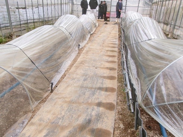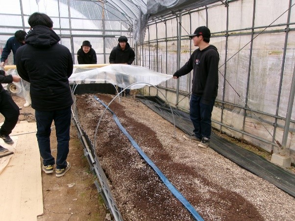 その後、施肥しトンネルを被せ、いよいよ保温開始です。春芽が収穫できる日が楽しみです!(野菜コース学生)