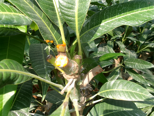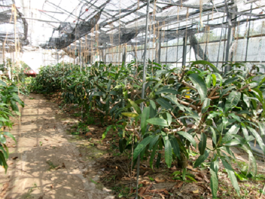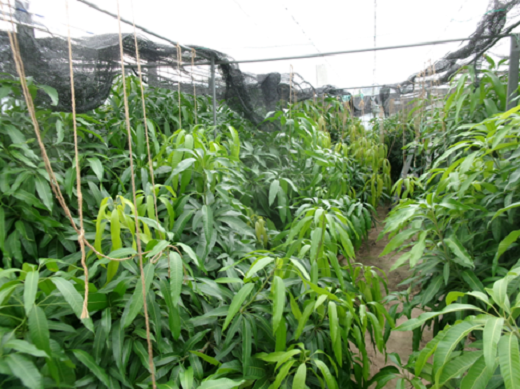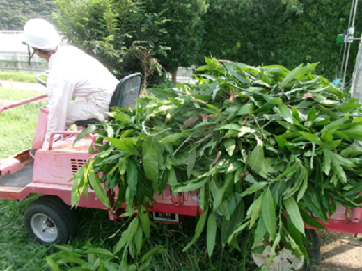 | 令和7年産マンゴーは、前年並みの8月中旬頃までに収穫がほぼ終了しました。今後は、早急に樹勢回復を行い、次年産に向けた優良な結果枝を確保する必要があります。 そこで、8月20~21日にせん定を行いました。せん定は、高くなった樹高を下げるために、上部に伸び上がった枝はできるだけ基部方向に戻すよう、節を残してせん定ハサミで切除しました。節を残すことで新梢の発生が促され、発生した新梢は、芽かきや誘引を行うことで充実した枝の育成につながります。10月以降になると気温の低下と共に花芽の形成に向けて誘導されます。