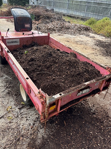 冬にせん定した枝を細かく粉砕し、腐敗果実をつぶしてものを混ぜ合わせたのもでたい肥を作っています。1年経ったものを10月8日にびわ園に施用しました。