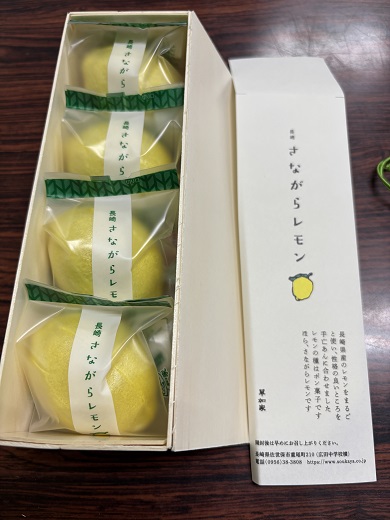長崎県立農業大学校産のレモンを使った和菓子(もなか)を佐世保市の「有限会社 草加屋」さんが開発しました。 1月22日に社長の高木氏が来校して商品の説明をしてくれました。 形状はレモンの形で、レモン果汁、レモンピールを使用しており、レモン感が強いお菓子となっています。