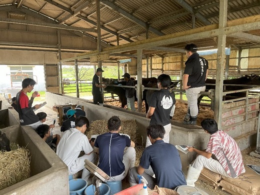 2年生の去勢肥育牛プロジェクトの進捗を確認するため、農技センター畜産研究部門から講師を招き、11月出荷予定の肥育牛5頭(生後22~23カ月齢)を対象にエコー検査を行いました。ちなみに、このエコー検査は、ヒトの妊婦さんのお腹に機材を当て、胎児の状況を確認する方法と同じ原理です。牛の場合は第6~7肋骨間に機材を当てて診断します。