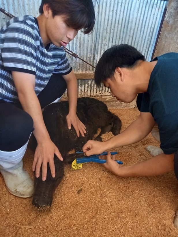 初産の「つな」号が分娩しました。雄の出生子牛は、学生が「海太郎3」と名付け、名付けた学生が耳標を装着しました。