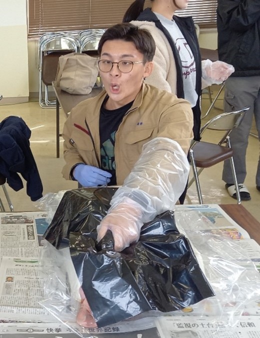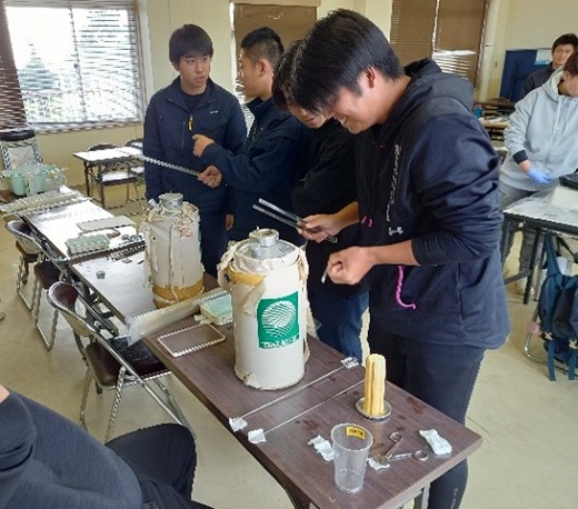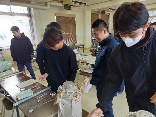 学生は家畜人工授精講習会の真っただ中で、この日は人工授精に使用する器具の準備の仕方や、解剖した子宮の子宮頚管へ精液注入器を通す練習をしました。