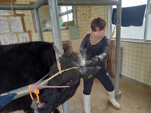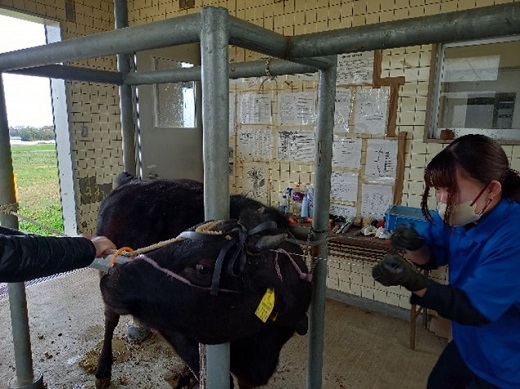 学生は、牛に長い間苦痛を感じさせないように、牛を思いやりながら、テキパキと作業を行いました!(畜産学科職員)