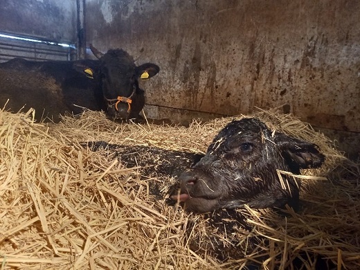 受精卵移植した「かりんとう」号が、予定から5日早く36kgの元気な雌仔牛を出産しました。 「かりんとう」号は初産であったことから、休日当番の学生と介助を行い、無事出産することができました。