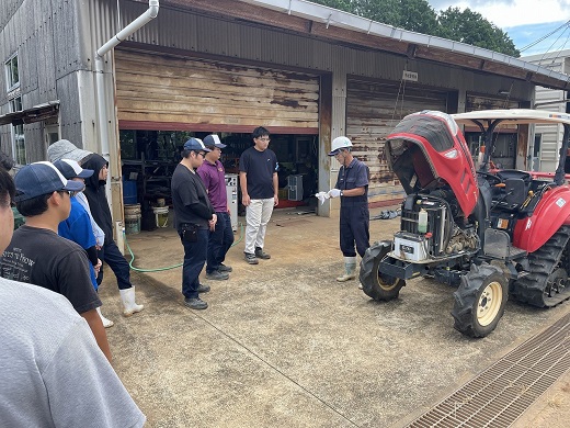 まず初めに、DVDで耕うん方法の種類などを学び、その後、トラクターやロータリーの始業前点検について、研修部職員からエンジンオイルやバッテリー液の確認等、点検の留意点について説明を受けました。