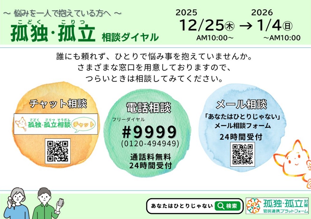 誰にも頼れず、ひとりで悩み事を抱えていませんか。内閣府では年末年始に合わせ、特設ウェブサイトを設けるとともに、以下の期間において「孤独・孤立相談ダイヤル#9999」を開設します。つらいときは電話 #9999(つながらない場合は、電話 0120-494949 )へ相談してみてください。チャット、メールでもご相談いただけます。