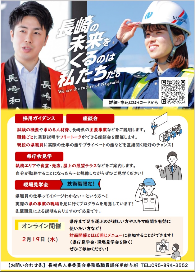 長崎県職員の仕事に関心を持っている方を対象に「長崎県職員採用ガイダンス&座談会」を対面式及びオンライン式で開催します。