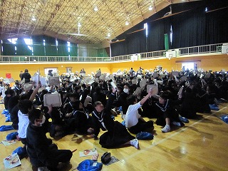 ・生徒の皆さんは、5人(4~6人)でチームをつくり、チームメンバーで協力して、合計6問のクイズに答えました。波佐見中学校全校生の皆さんはとても熱心に、講義やクイズに参加してくれました。