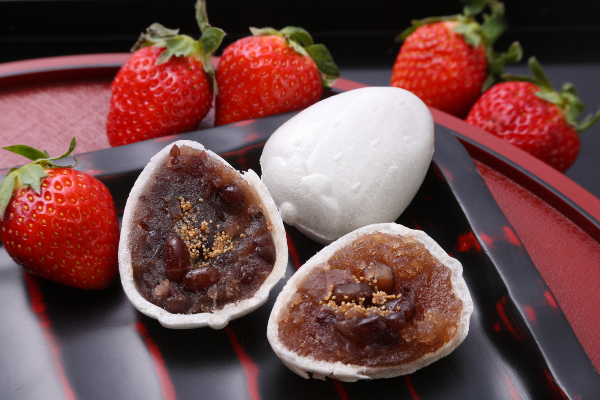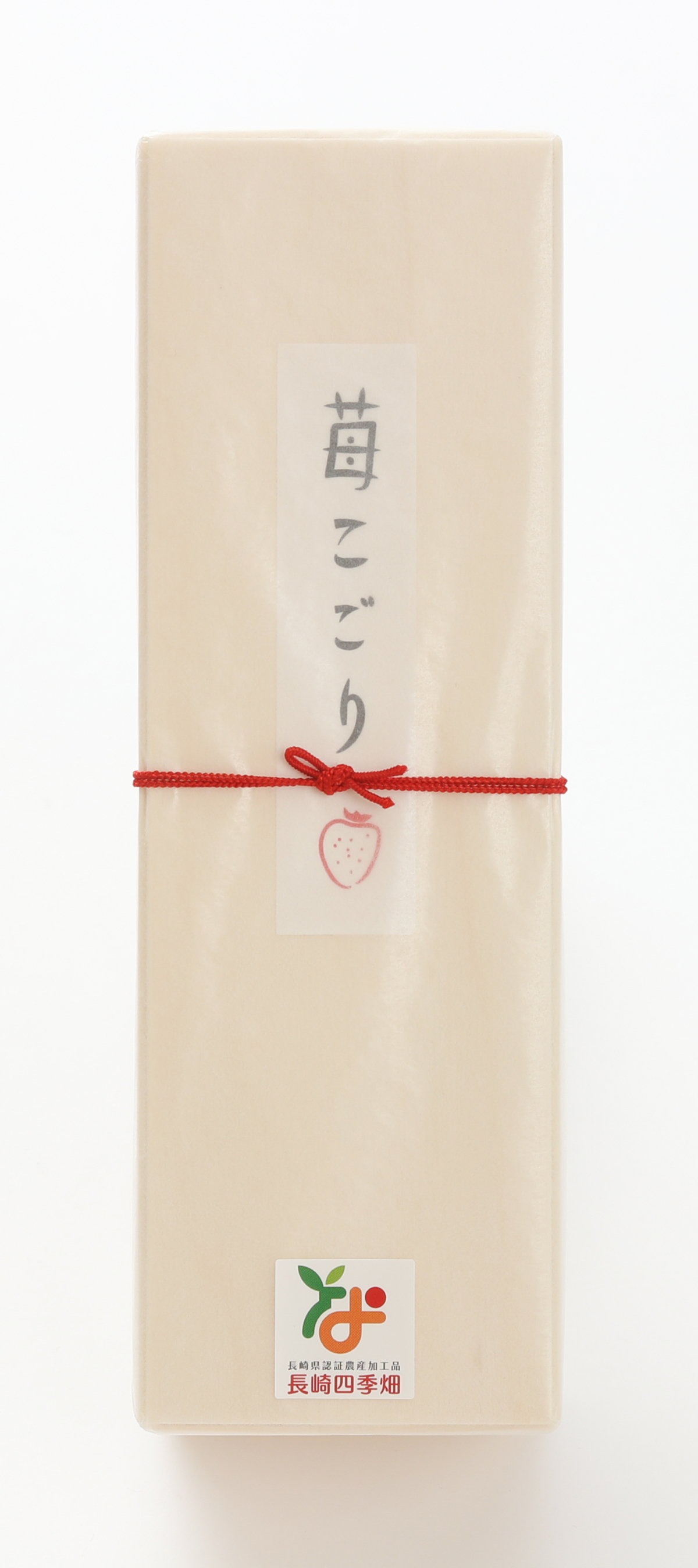 苺の形の最中に、長崎県産の苺を新鮮な風味の煮こごりにして、大納言あんと仲良く最中に詰めました。和の満足と果物のさわやかさ。香料、着色料不使用。