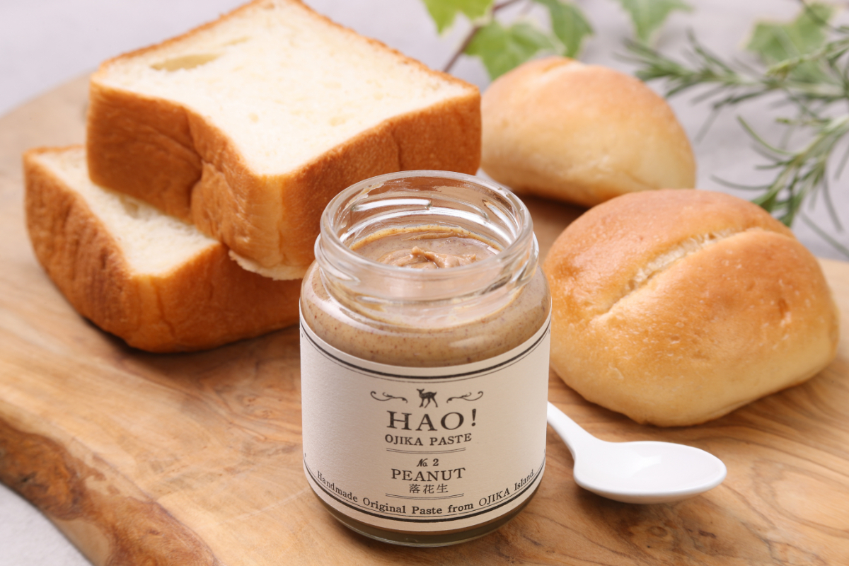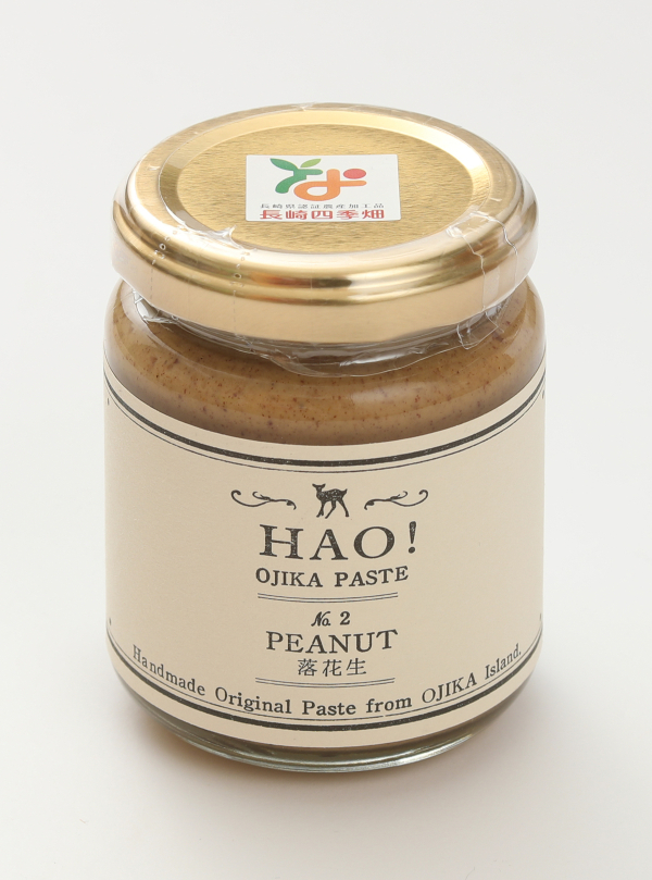 このHAO!と言うのは、小値賀島の方言で驚きを表す言葉です。落花生を焙煎後に、ポリフェノールを豊富に含んだ薄皮を付けたまま石臼式のミル機でペースト状に加工しています。赤土育ちの落花生のみを100%使用した商品です。